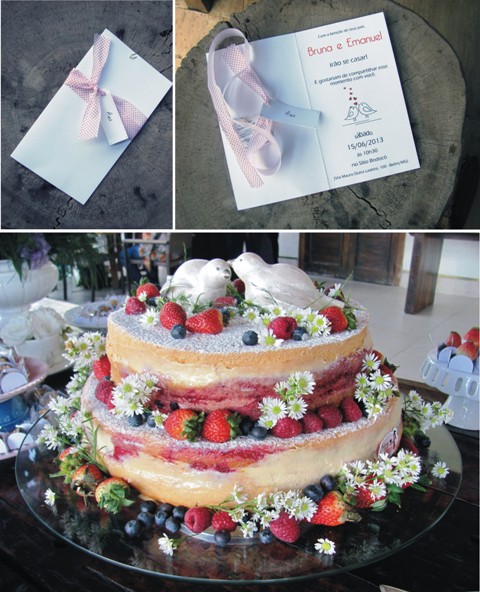 Pra combinar com o convite, já posto logo a foto do bolo, feito de frutas vermelhas com limão siciliano. Em vez dos tradicionais noivinhos no topo, Bruna optou pelos passarinhos. Aliás, vi passarinhos em muitos lugares.