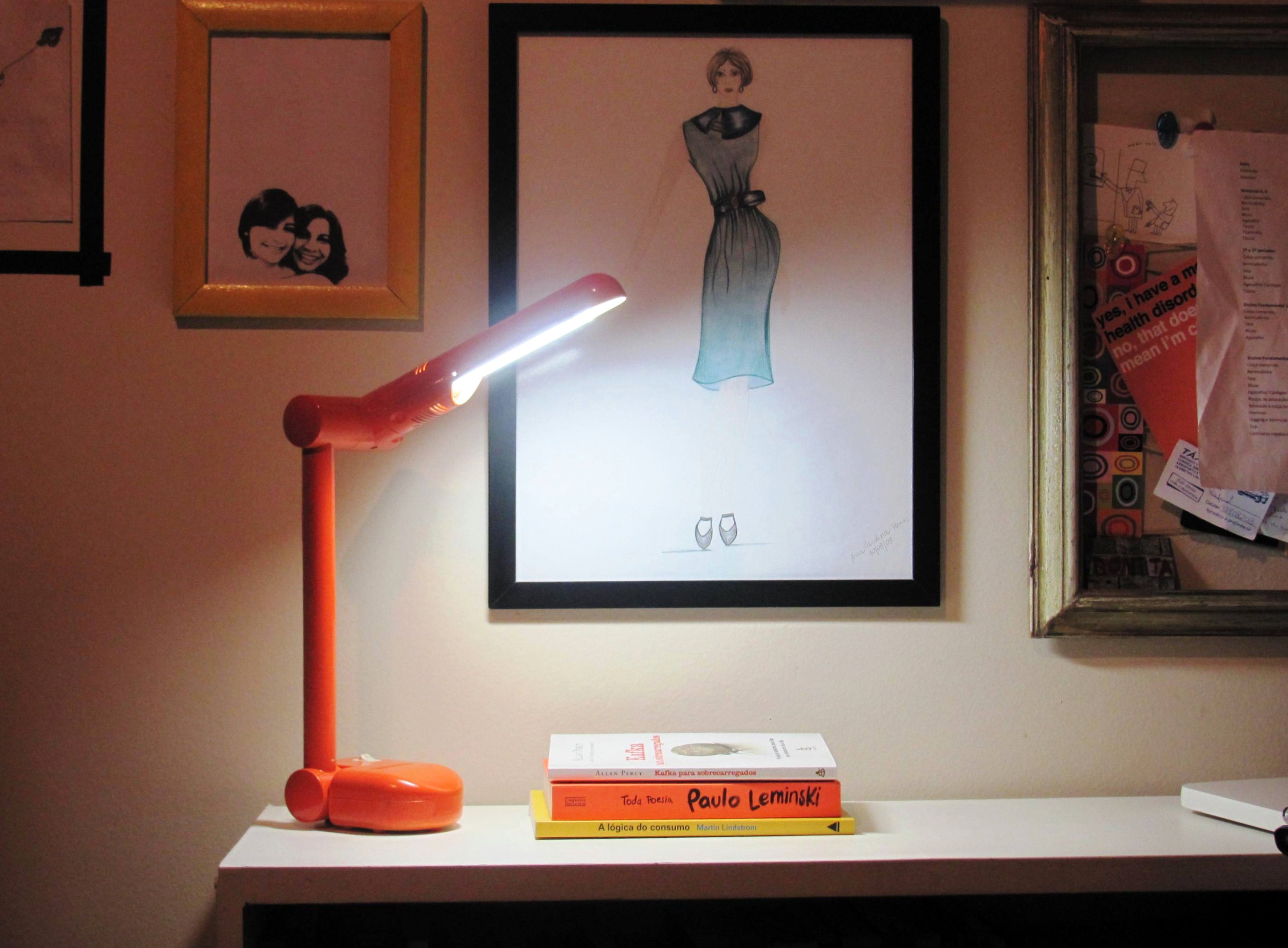 Foi mais ou menos com esse raciocínio que eu reformei a luminária “baratex” que estava encostada em casa, usando tinta em spray pra plástico na cor laranja. Fora isso, só precisei de jornais velhos, um dia bonito e 24 de paciência até secar tudo. E eis mais um pontinho de cor e luz no quarto.
