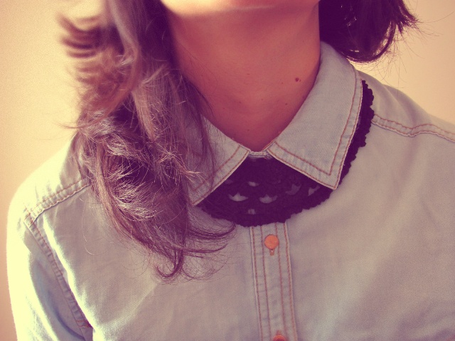 As peças fotografadas foram dois colares de crochê, de amarrar no pescoço, e uma bolsa que ela fez pra mim em um sábado. Ela sabe tricotar o colete que estou usando em duas das fotos também, mas neste caso era uma peça do meu pai, pela qual tenho um apego infinito. É que eu sempre me lembro da infância, quando ele usava o colete por baixo do uniforme da fábrica para ir trabalhar quentinho.