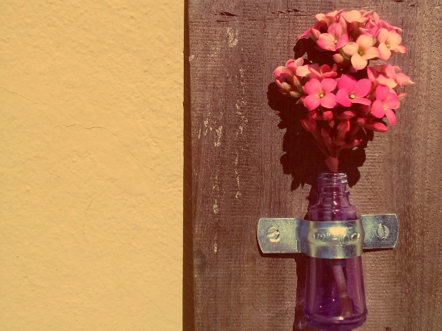 Toda essa prosa só pra contar do projeto da foto, que não tem passo a passo fotografado porque nasceu assim, de supetão. Tudo começou num sábado de manhã de agosto, ao fazer as unhas – já que essa coisa de ser manicure me deixou com a impressão de que ninguém faz minhas unhas tão bem quanto eu-. A ideia veio enquanto eu olhava um vidrinho de extra-brilho vazio. Depois foi só ligar pra minha mãe, que migrou do salão pra uma loja de pequenezas de construção, encomendar a abraçadeira de metal e os parafusos e encontrar um pedaço de madeira. Claro, teve a florzinha também.