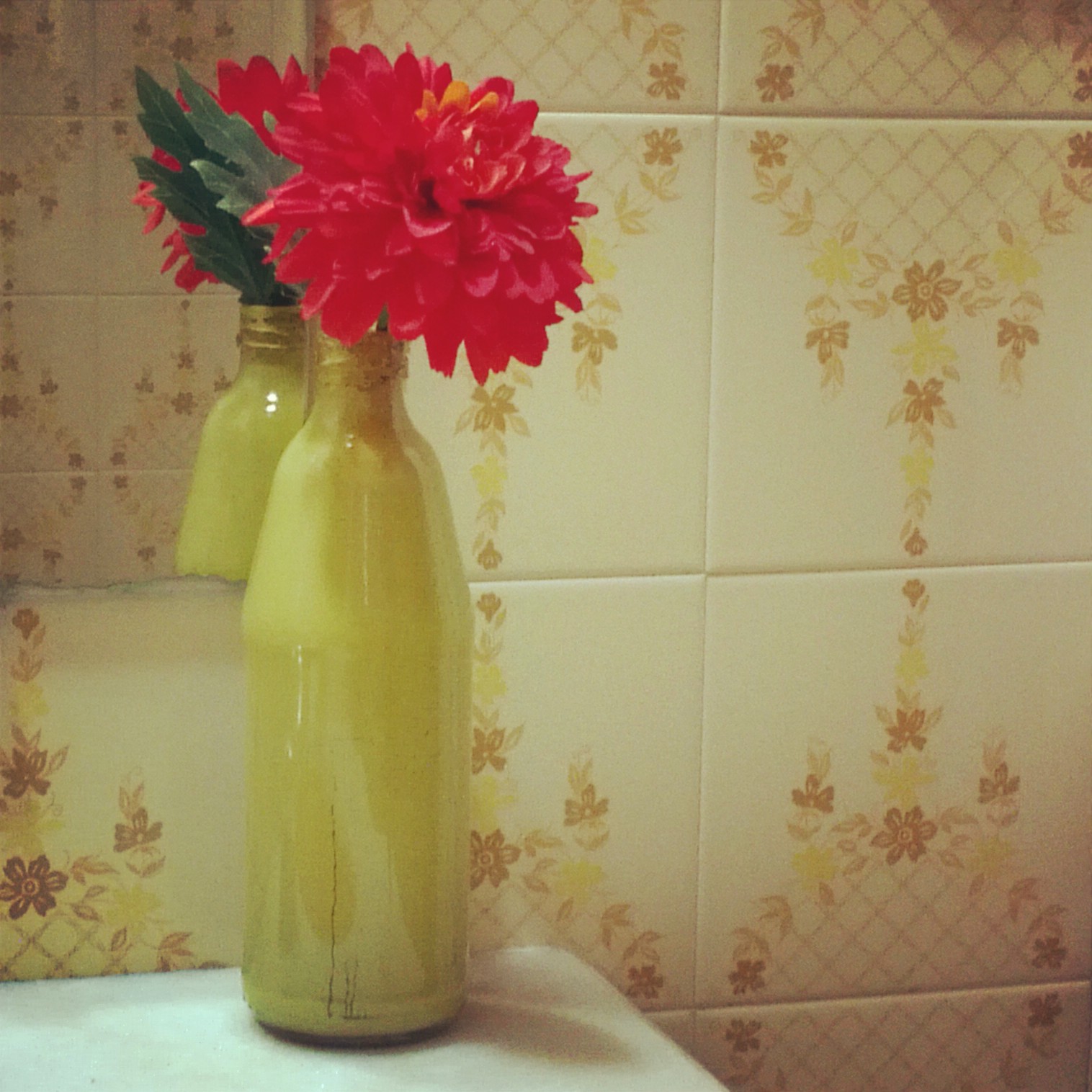 A parte boa é que já tô dando jeito nisso… E pra começo de conversa, dá uma olhadinha na garrafa de polpa de suco que virou porta-flor-de-plástico. Tá lá no meu banheiro de azulejo antigo. 🙂