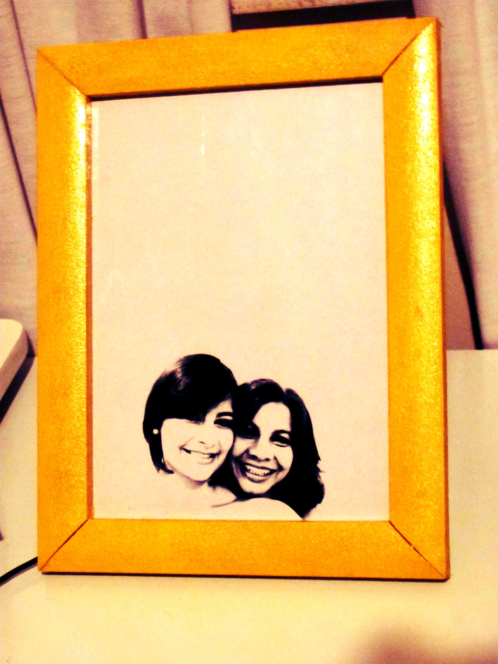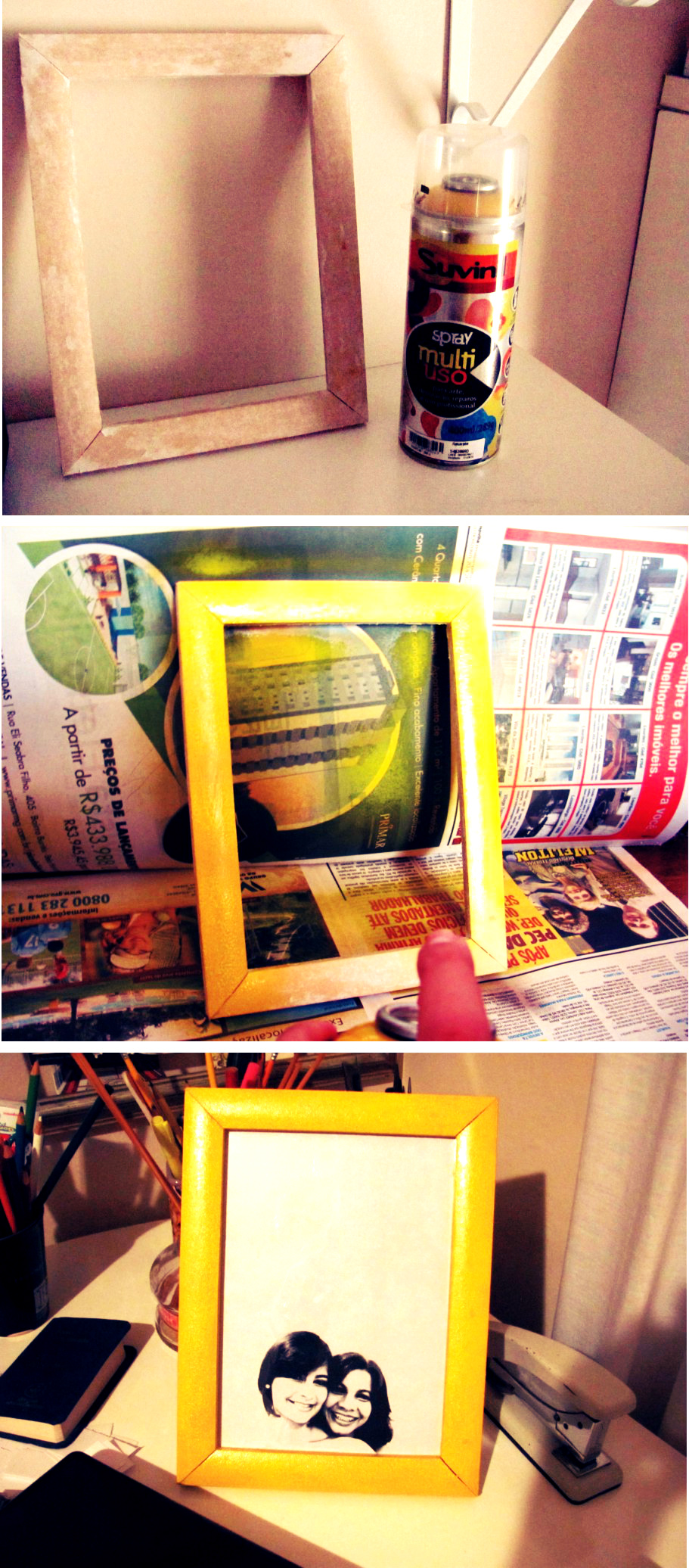 Toda mãe gosta de porta-retrato pra colocar foto dos filhos, certo?! Então que o projeto de hoje é uma forma um pouquinho diferente de dar esse presente pra sua mãe. Moldura + tinta em spray amarela + foto menos convencional (com espaço pra escrever recadinho).