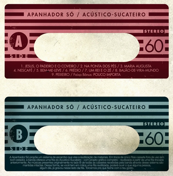 “A Apanhador Só propõe um sistema de escambo que visa a reutilização de materiais. Em troca de cinco fitas cassete fora de uso (em bom estado), a banda oferece uma fita do Acústico-Sucateiro – com projeto gráfico completo – reutilizado a partir de uma fita tocada anteriormente. As músicas presentes originalmente no lado B de todas as cassetes recebidas pela banda através desse sistema são mantidas intactas. Dessa forma, se você tem em mãos uma fita reutilizada, poderá ouvir o que alguma pessoa, algum dia, já gravou nesse lado da fita. Torcemos pra que feche com o teu gosto.”